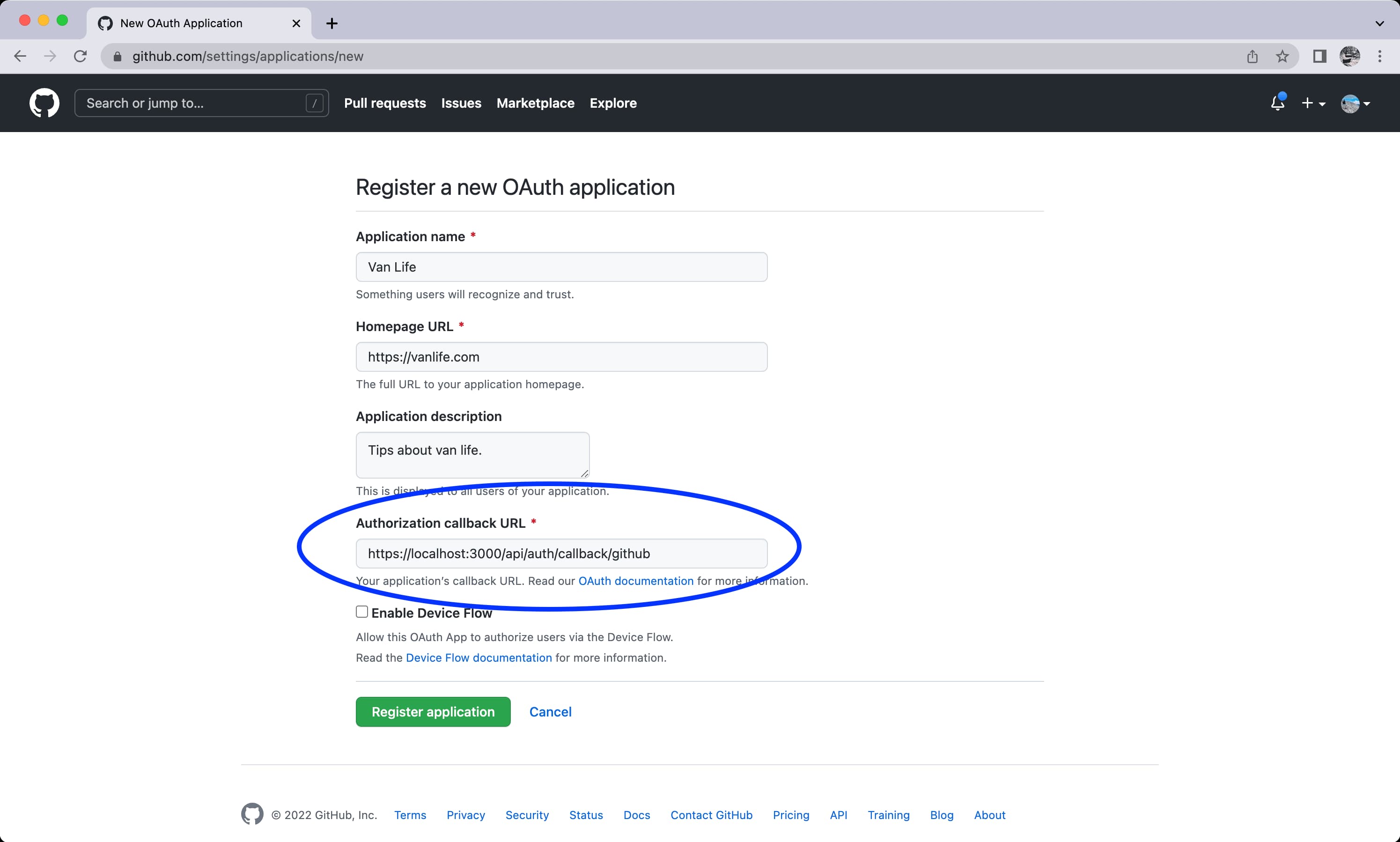 https://app.company.com/api/auth/callback/githubOnce you’ve entered all the required fields, press “Register application”.